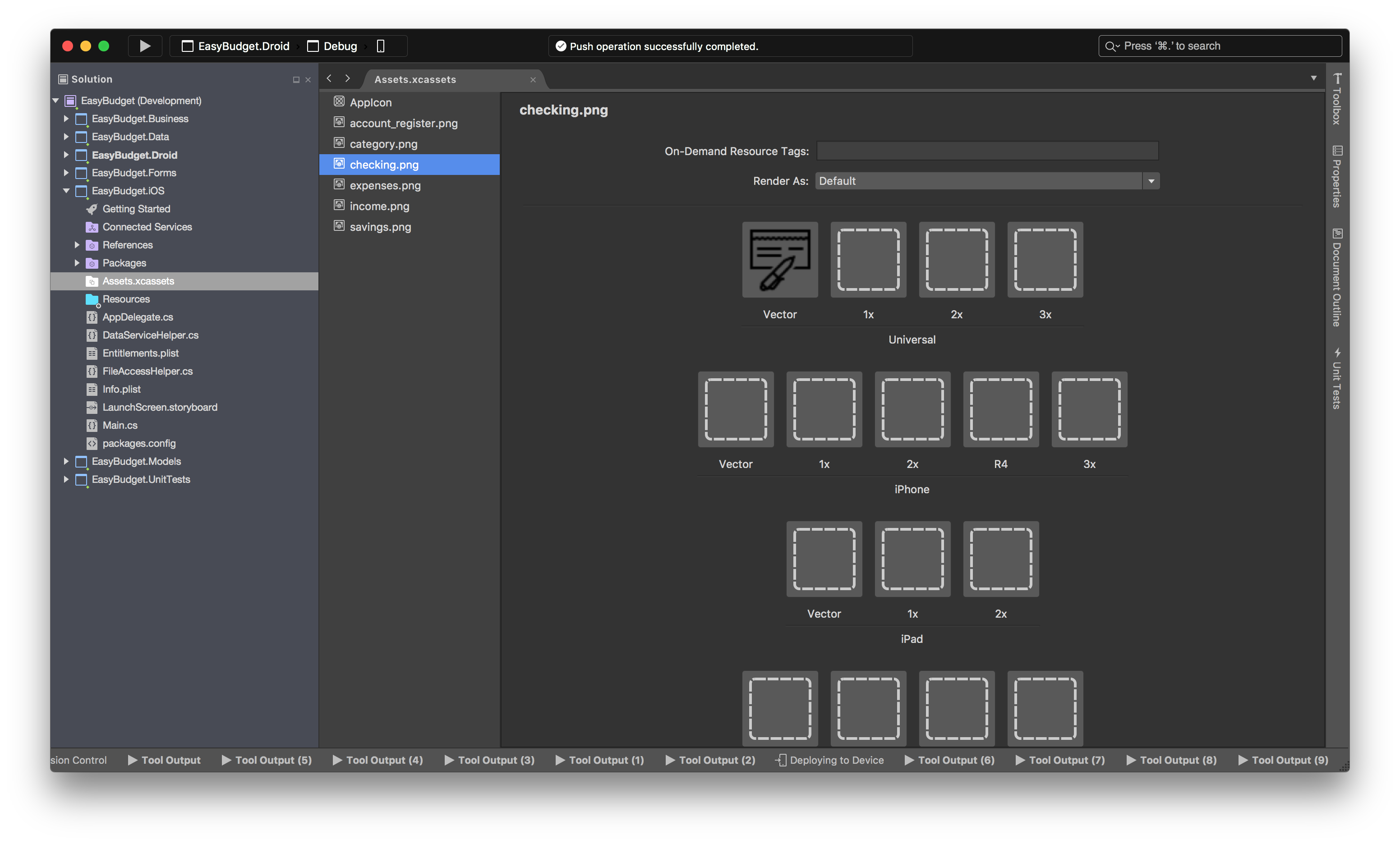 In iOS, images are first converted to vector PDF files and then loaded into the Assets.xcassets resource. Repeat for each image used. Placing the vector PDF file in the vector image slot allows the application to create the sized images dynamically. Use the name of the related .png file for the name of the image asset. This will allow us to reference images by the name inside the Xamarin Forms project’s page XAML controls.